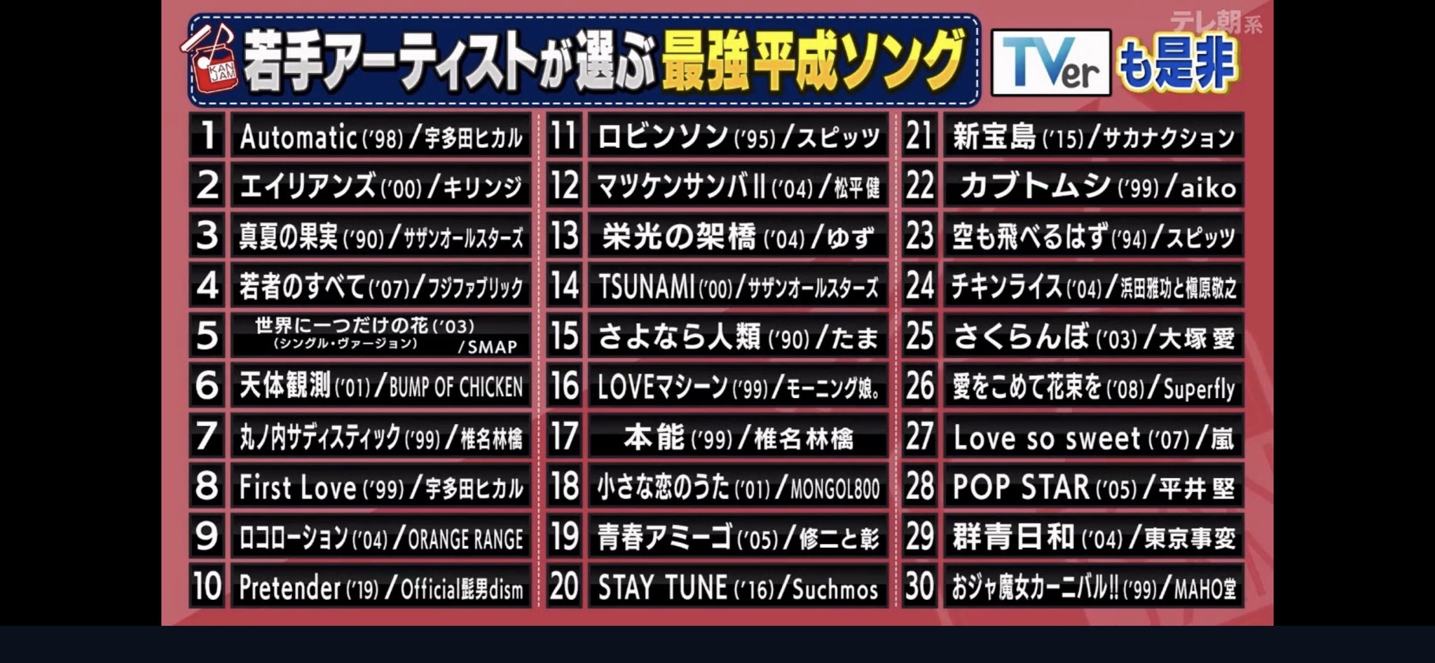 「平成時代に一番感動した歌」ランキング (スカパー、10代~60代の男女1万人に調査)